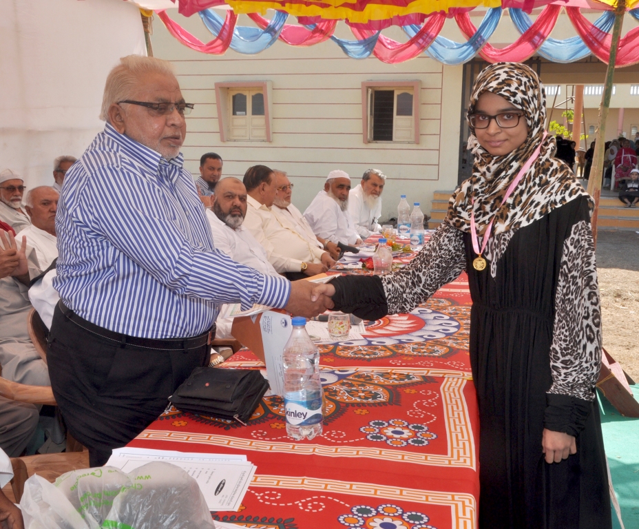 Aysha Ahmed Salehbhai received cash reward and cerificate form Janab Yusufbhai Jina (U.K.) |
