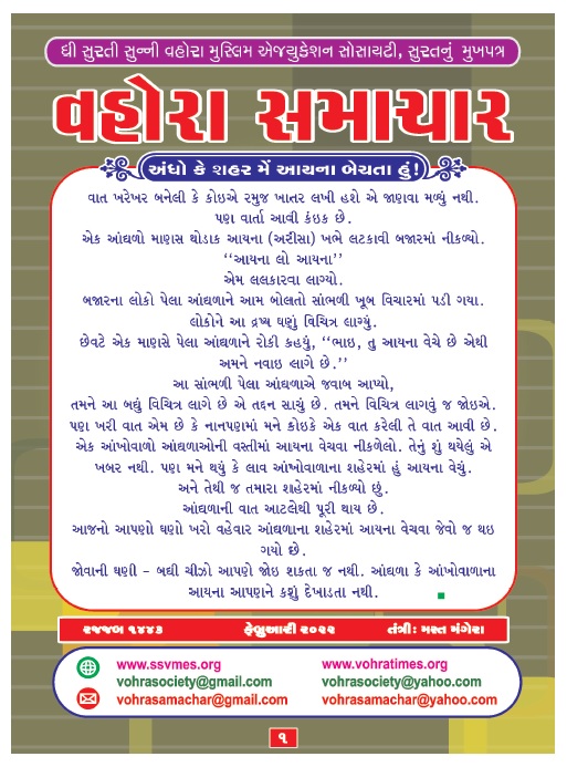 Keeping in view the sincere wish and to honour the feelings of our well wishers of abroad, the managing committee and the board of council of our society have decided to convey 74th Annual General Meeting of The Suratee Sunni Vohra Muslim Education Society on 13th February 2022 (Sunday), 10:30 A.M. sharply at our A.Y.Dadabhai Technical Institute, Kosamba. Patron, Wise Patron, Life Member, Village Representatives and co-opt members are requested to present in this meeting. |