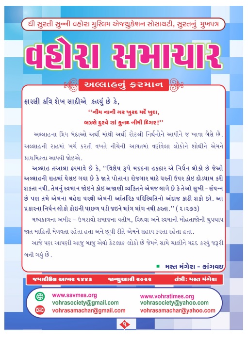 Well wisher of our society Marhum Kari Aiyub Jiva's wife Mohtarma Ayshabahen passed away on 24-12-2021 at Kosamba. |