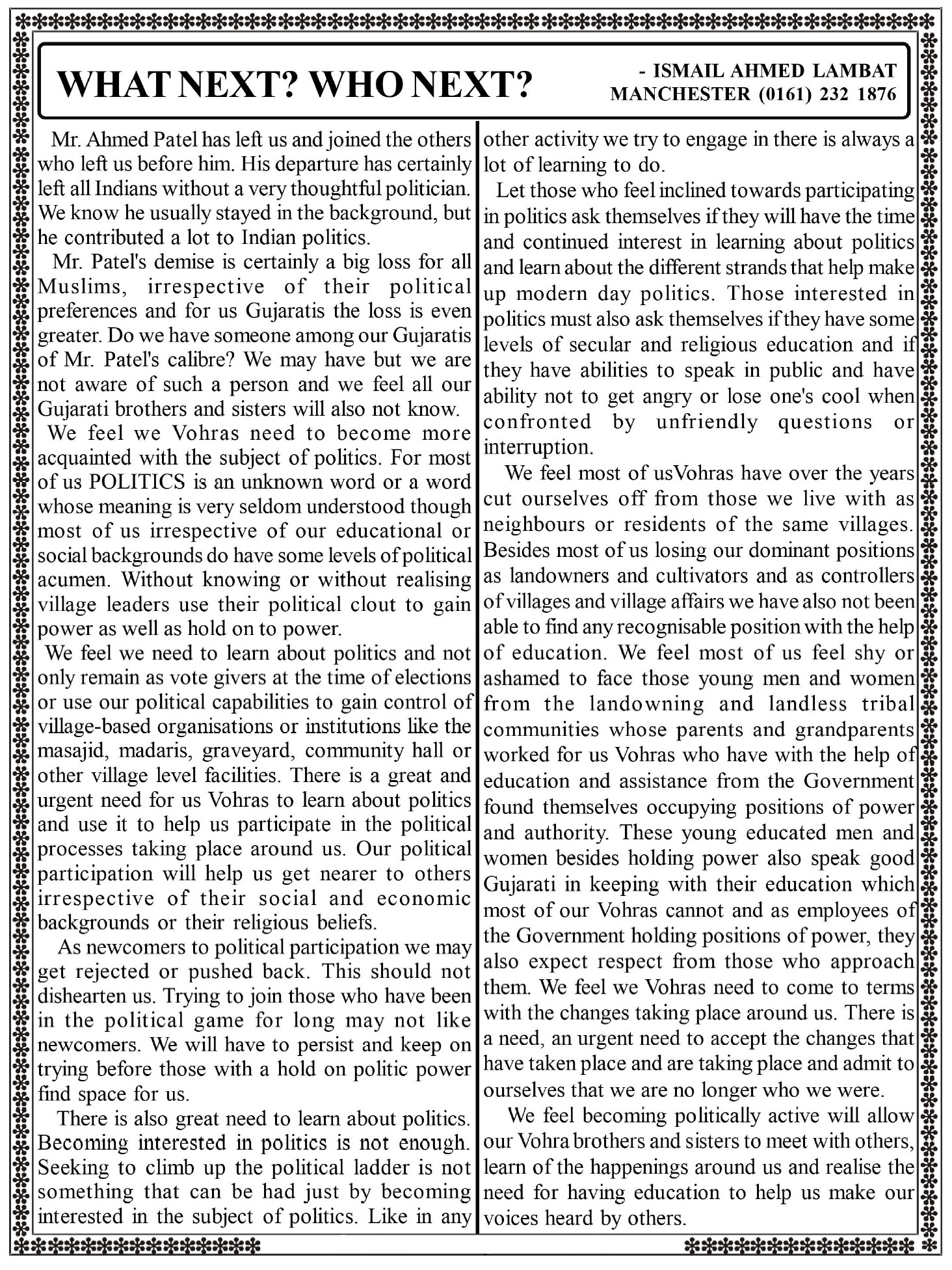 - DEATH (INNALILLAH) : Ahmed Muhammad Dadipatel Lajporwala and Habibhai Pathan Valodwala passed away.