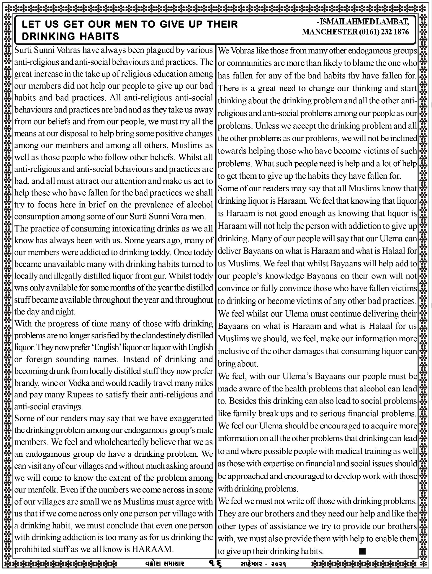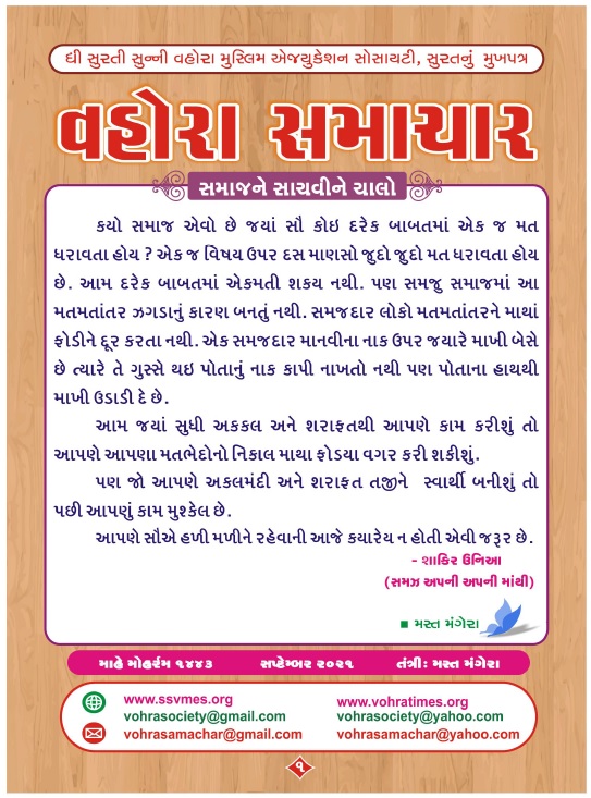 Janab Ismailbhai Lambat Sb. native of Chasa village and also writer of English articles in our Vohra Samachar since many years. His wife Ayshabahen passed away on 05-08-2021 at Manchester-UK. May Allah forgive him and accept his good deeds and reward him in the highest position of Jannatul Firdaus and give patience to his family. Aameen. |