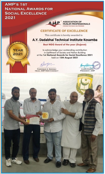 Our A.Y. Dadabhai Technical institute, Kosamba selected as a Best NGO award of the year for outstanding contribution in upliftment of society and nation building presented by Association of Muslim Professionals (AMP). This award received by Mr. M.M.Dalchawal (Director of AYD) on 22-08-2021 at Ahmedabad. |
